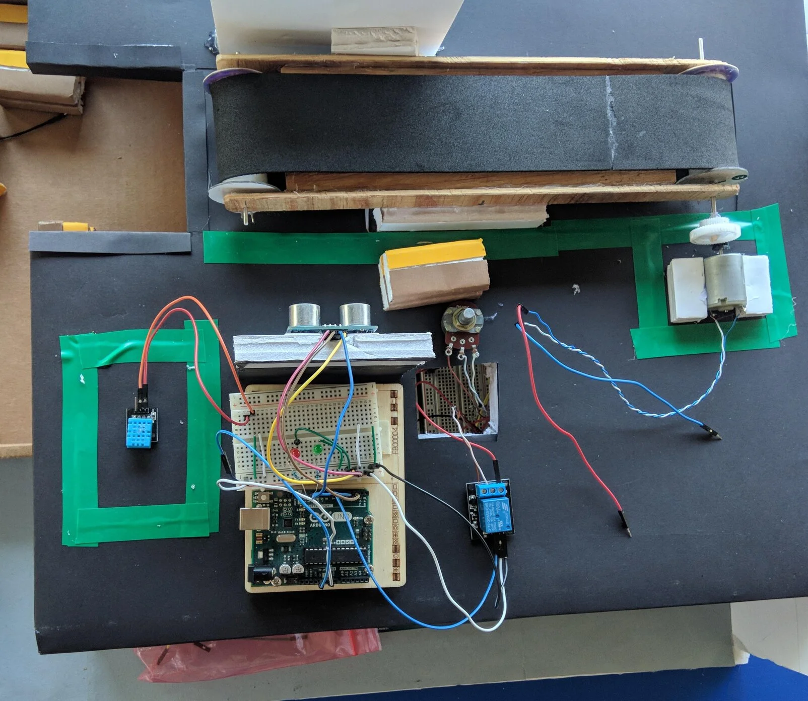 Proyecto grupal consistiendo en una simulación de una banda transportadora impulsada por un motor DC controlado un circuito electrónico conformado por un timer 555, diodos y transistores para un control PWM. Esta banda transportadora mueve paquetes los cuales son contados por un sensor ultrasónico, y al llegar al número objetivo de paquetes la banda cesa operaciones. Adicionalmente cuenta con control de sobretemperatura para el motor simulado con un sensor de temperatura.