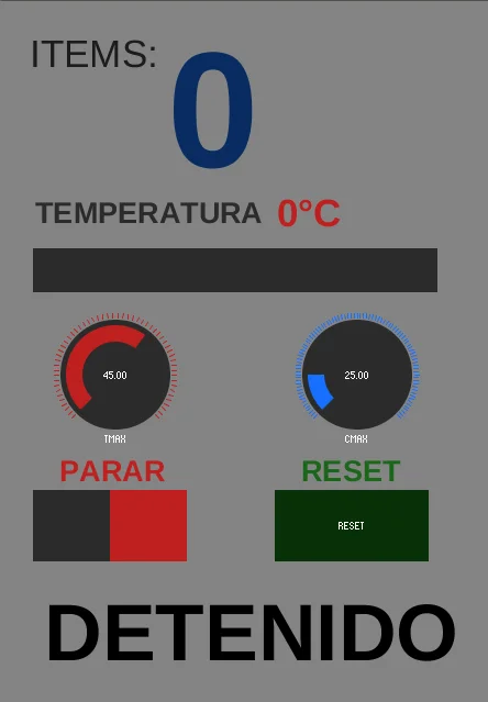 Las unidades movidas, el número objetivo de paquetes y la temperatura de operación objetivo se pueden visualizar controlar a través de una interfaz hecha en Processing la cual se comunica con el Arduino mediante el puerto serial. Mediante la interfaz se puede detener e iniciar el movimiento de la banda transportadora, con ayuda de un relé conectado al Arduino.