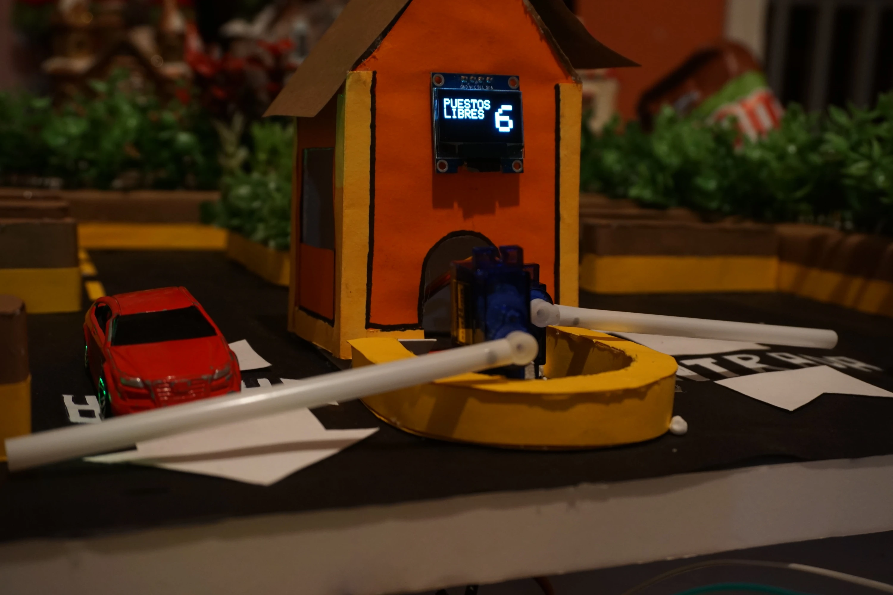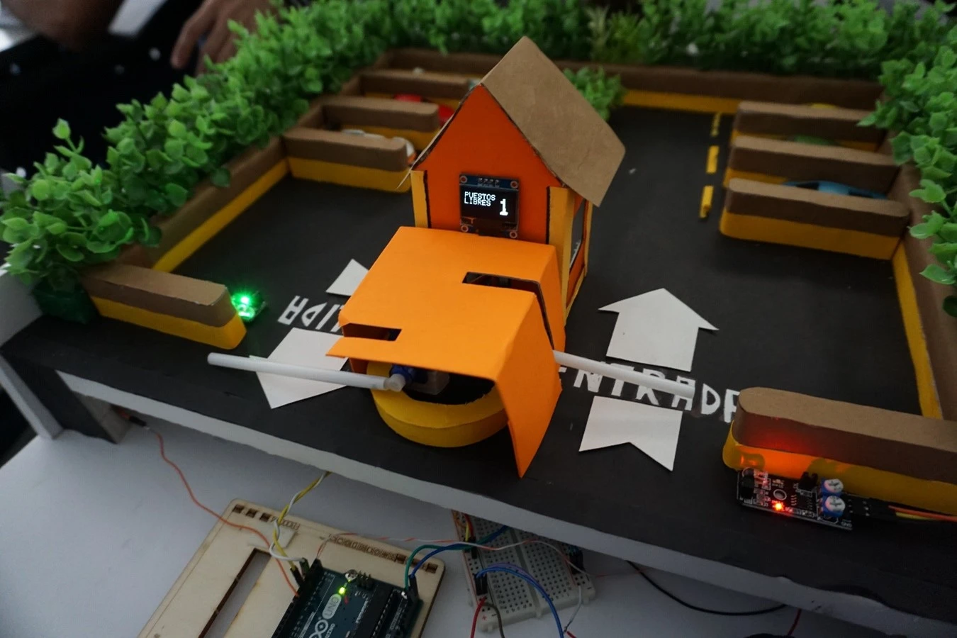 La pantalla OLED cuenta con animaciones para cuando entra o sale un carro y para cuando no hay carros libres. Se usaron servomotores para simular las trancas de los parqueos, y una aplicación para convertir un celular en cámara web, para luego analizar los elementos presentes en la imagen. El método de detección de imagen utilizado fue TinyYOLOv3, por alto rendimiento.